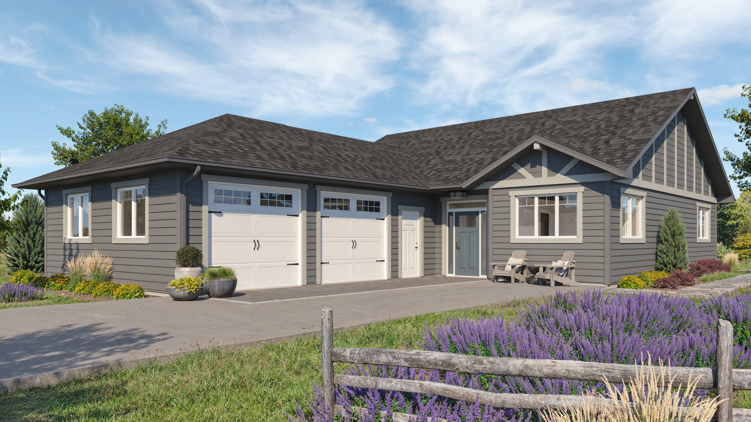The Cascade is 1470 square feet with two bedrooms plus a den, two bathrooms and an attached two car garage.