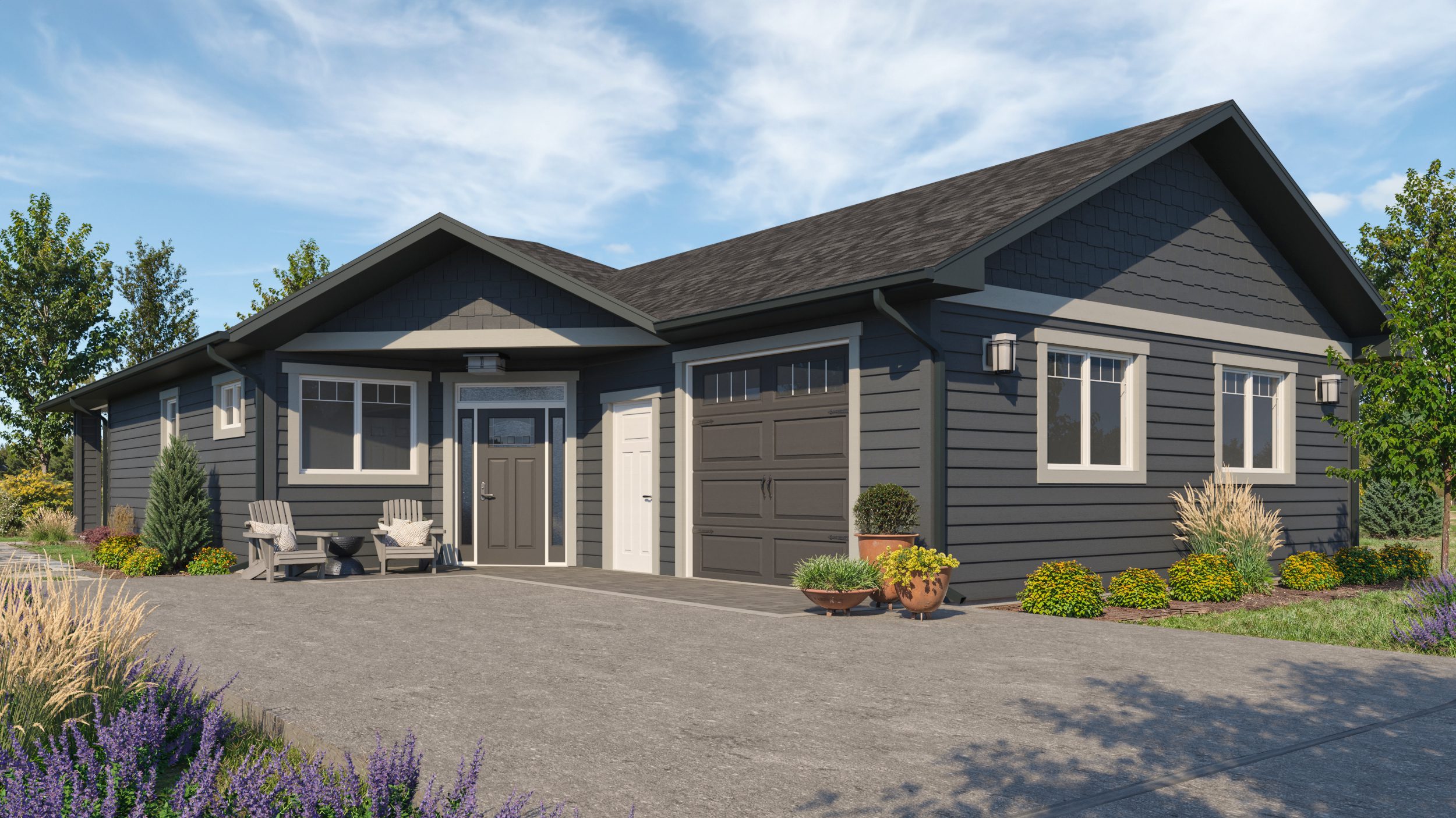 The Bosc is a 1056 square foot home with one bedroom plus a nook, one bathroom and an attached single car garage.